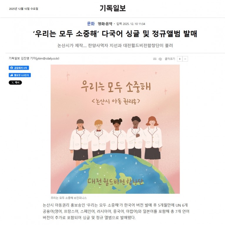 [기사] ‘우리는 모두 소중해’ 다국어 싱글 및 정규앨범 발매(기독일보)