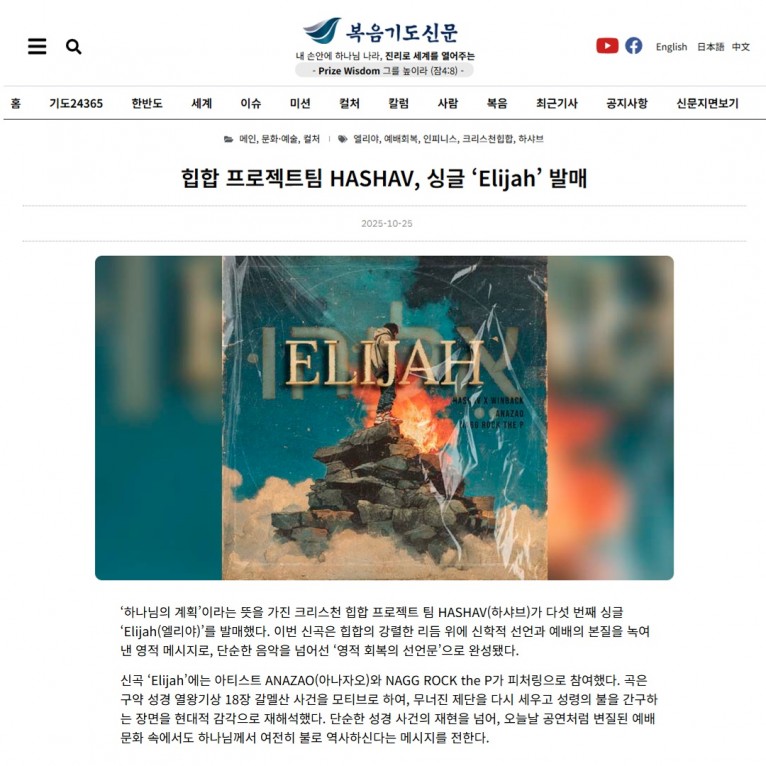[기사] 힙합 프로젝트팀 HASHAV, 싱글 ‘Elijah’ 발매(복음기도신문)