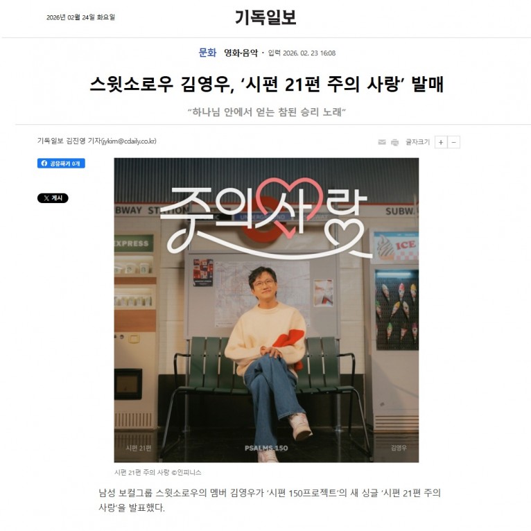 뮤직타임 [기사] 스윗소로우 김영우, ‘시편 21편 주의 사랑’ 발매(기독일보)